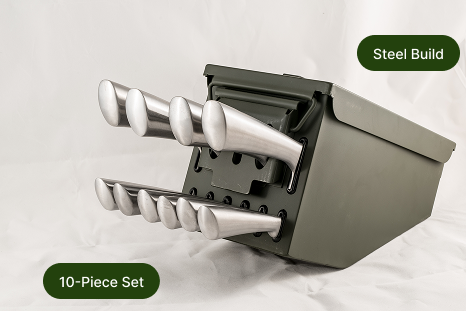 A 10-piece stainless-steel knife set stored inside an