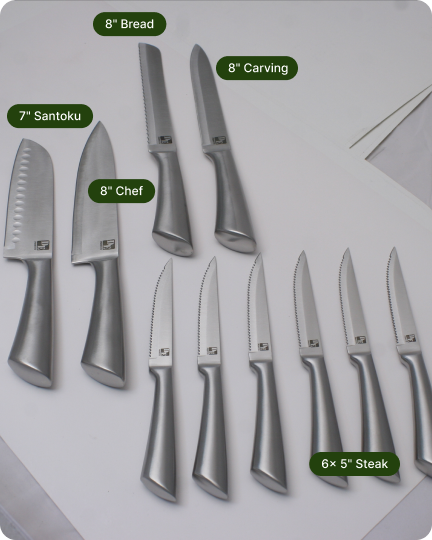 Everything you need for everyday prep steaks, bread, carving, chopping, and clean slicing.
