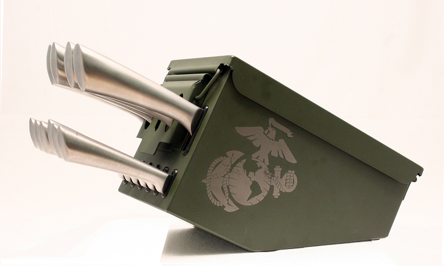 ammo-box-inspired block with a hinged steel lid built to stand out on your counter.